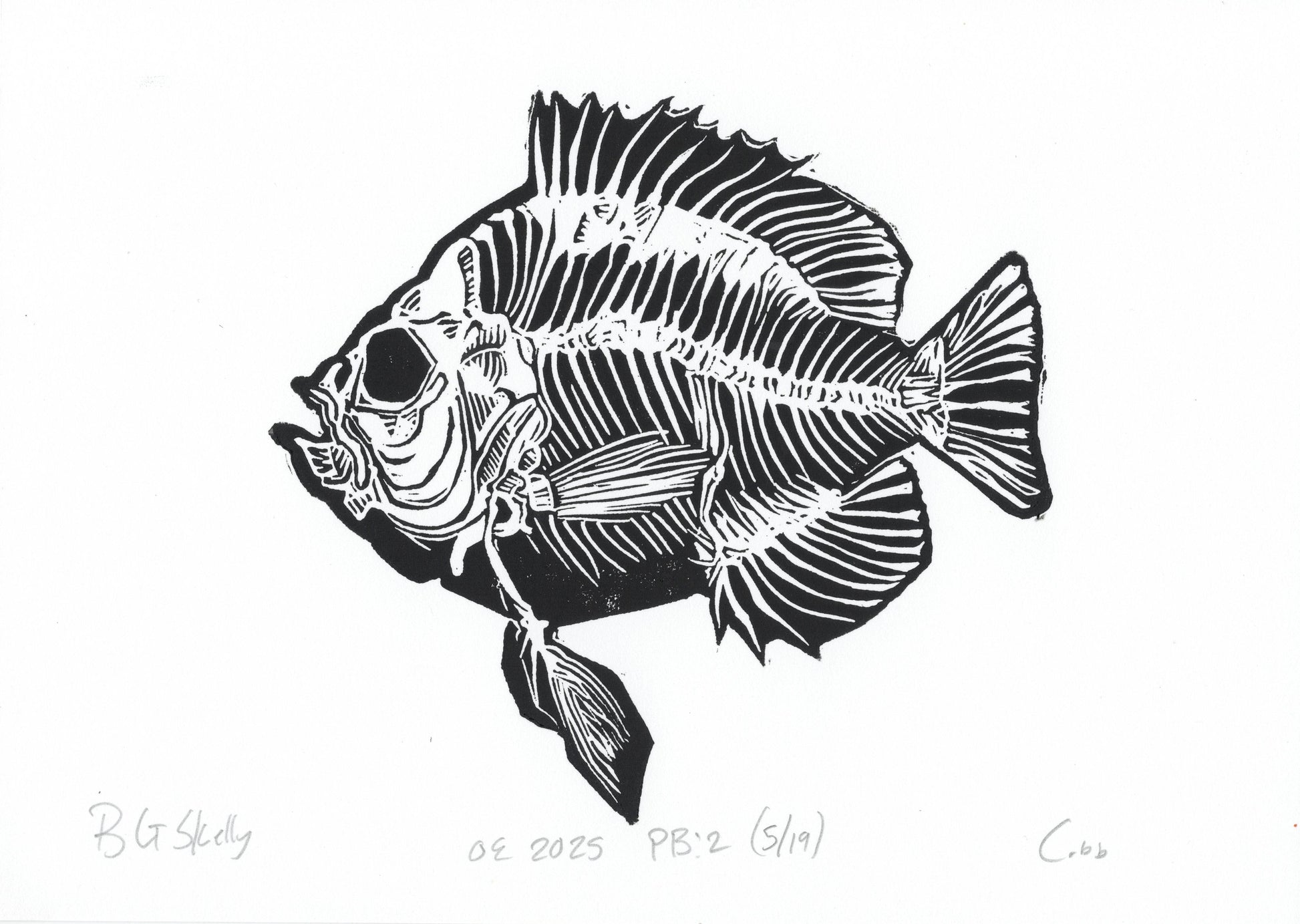 Hand-carved linoleum stamp hand-printed in small batches on 5x7 paper. Numbered and signed! My Bluegill stamp died, so I carved its corpse. How macabre!